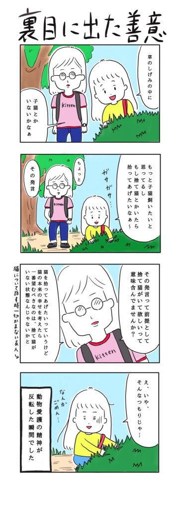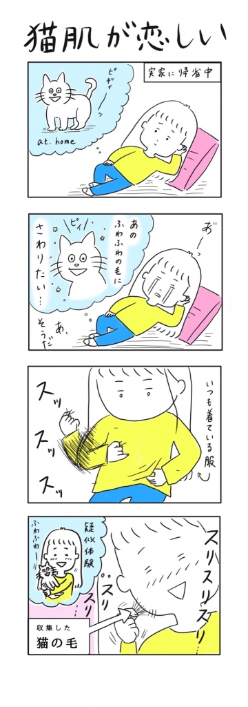 JUGEMテーマ:4コマ漫画 GWは実家に帰省していたので、猫に会えなくてつらかったです。 一日でも会えないと不安な気持ちになるので、すっかり猫依存症患者です。 そして、そういうときに服やカバンについている猫の毛にとても癒やされております。 もはや毛一本すら可愛い存在、それが猫…! 電車の中とかで服についている動物の毛を必死でかき集めている人がいたら ...