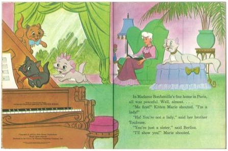 JUGEMテーマ:ディズニー=ピクサー 4月9日の続きです。 ディズニーのリトルゴールデンブック「おしゃれキャット(The Aristocats)」の中身をちょこっとお見せします。 舞台はフランスのパリ。 猫のダッチェスとそのこどもたちは裕福な老婦人の元で、何不自由なく楽しく暮らしていました。 しかし、老婦人が財産をダッチェスたちに残すよう遺言書を作ったことを知った執事の悪だくみによって、ダッチェスとこどもたちは見ず知らずの土地に捨てられてしまい...