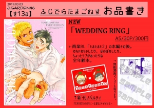いよいよ明日、平成最後のJ庭ですね! 有難いことにスペースを頂けたので、お知らせをば…! Bホール【せ13a】ふじでらたまごねす 新刊:『WEDDING RING』A5/30P/300円 (新刊掲示板には40Pと記載していたのですが変更となりました。) 商業連載していた「とまとまと2」本編その後です。 2は短編だったこともあり紙の単行本にはなっていないので、 電子未読の方には「誰や、このキャラ」祭りになってしまうかと\(^p^;;)/すみません (一応、本に...