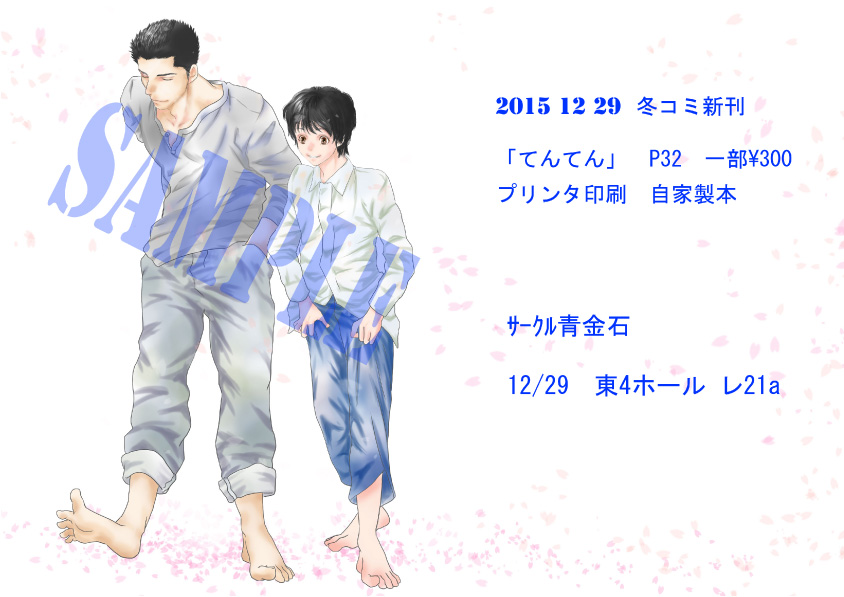 JUGEMテーマ:イラスト・同人 冬コミ新刊、完成いたしました! 新作です!(2年ほど寝かせておりましたがw) 表紙カラーはこんなカンジです。 コチラは人物だけ。 冒頭のシーンww 2年も熟成(?)してしまったため、 絵柄が多少変化しております。 最初P16くらいにするつもりだったのが P24になり、最終的にP32で完成です(^_^;) プリンタ印刷の自家製本になります。 通販の方は来年、通販環境を整え次第 1月には通販できるようにいたします。 冬コミ新刊(新作です!) 「てんてん...