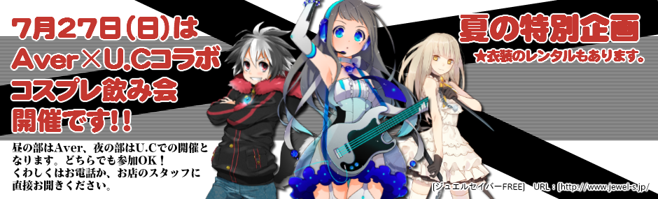 JUGEMテーマ:コスプレ サブカルバーU.Cとコスプレカフェ&バー A verのコラボ! コスプレイベント開催! 7月27日(日) コスプレイヤー限定で飲み会しましょ! 飲むも良し、撮影するも良し ☆昼の部 A bar で開催 ★夜の部 U.C で開催 ――――――――――――――――――――――――――――――――――――――――――――――― 昼の部☆コスプレカフェ&バー A ver. 時間:13時〜16時(着替え等の為、12時開店します。) 料金:男性2,000円、女性1,500円 住所:静岡市葵区両替町2-2-11 中日本ビル4F 電話番号:054-221-8811 フリードリンク制となります...