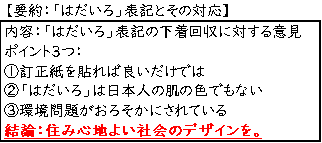 JUGEMテーマ:自己実現 おはようございます! 本日も、ご訪問ありがとうございます。 今回は「はだいろ」表記とその対応について。 ファミマ、「はだいろ」表記のPB下着を回収(朝日新聞デジタル) - Yahoo!ニュース を興味深く読みました。 ファミリーマートで販売された、下着の表記が「はだいろ」となっていることが不適切との指摘を受け、該当する下着を回収したそうです。 人種によって肌の色は異なることから、「はだいろ」は人種差別を起こしかねないため、近年で...