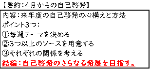 JUGEMテーマ:自己実現 おはようございます! 本日も、ご訪問ありがとうございます。 今回は来年度の自己啓発について。 令和2年度最後の週末となりました。 来年度の自己啓発として私は下記を取り組みたいと思います。 ?毎週テーマを決める これまで、その時々で興味あるものを場当たり的に学習してきましたが、これからは毎週テーマを設定し、テーマに合わせて教材(本、動画など)を選んでいきたいと考えています。 ?3つ以上のソースを用意する テー...