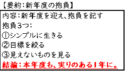 JUGEMテーマ:自己実現 おはようございます! 本日も、ご訪問ありがとうございます。 今回は新年度の抱負について。 新年度を迎え抱負を簡単に記します。 ?シンプルに生きる 昨年度もかなり進めてきたことですが、やはりシンプルな生き方のほうが私には合っていると感じます。 ただでさえ、知らなければいけないこと、考えなければいけないことが多い世の中ですから。 ?目標を絞る シンプルに生きることは、目標においても同じことです。 いろいろな指...