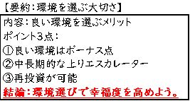 JUGEMテーマ:自己実現 おはようございます! 本日も、ご訪問ありがとうございます。 今回は、環境を選ぶ大切さについて。 「何事も気持ち次第」とよく言われますが、メンタルをコントロールすることほど難しいことはありません。 一方で、良好な環境は良好なメンタルを築くことに非常に役立ちます。 良い環境を選ぶメリットをまとめます。 ?良い環境はボーナス点 「良い環境」とは自分の気分を高めてくれる環境のことです。 良い環境を選ぶと、純粋に気分に対して...