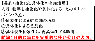JUGEMテーマ:自己実現 おはようございます! 本日も、ご訪問ありがとうございます。 今回は、抽象化と具体化の有効活用例について。 物事を一般化・普遍化させることで本質を捉えることを抽象化、 一般的な原理原則を個別のケースに当てはめることを具体化といいます。 これらをうまく活用することは、生活において非常に役立ちます。 今回はそんな例を紹介します。 ?抽象化による対立軸の消滅 物事を抽象化するほど、内容が曖昧になり、違いが不明瞭になります。 ...