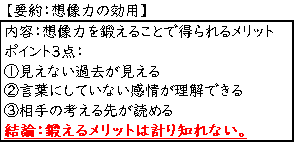 JUGEMテーマ:自己実現 おはようございます! 本日も、ご訪問ありがとうございます。 今回は、想像力の効用について。 最近、私は想像力を働かせることが楽しみの1つになりました。 簡単に言えば、相手の話から言葉にしていない部分を想像によって作り出す作業です。 1つ1つの言葉を手掛かりにその関係や因果を考える作業になります。 想像力が身に付くと、こんなメリットがあります。 ?見えない過去が見える 想像力を高めていくことにより、見えなか...