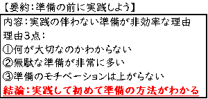 JUGEMテーマ:自己実現 おはようございます! 本日も、ご訪問ありがとうございます。 今回は、準備と実践の関係について。 私は人生の中で、大切な本番が控えていたら、入念に準備をしてきました。 一方で、準備に時間を割けどもなかなか作業が捗らないことが多くありました。 多くの場合、実践経験不足によるものです。 私は下記の理由から、準備の前には実践が必要だと考えています。 ?何が大切なのかわからない まず、実践経験がないと何を準備するこ...