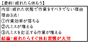 JUGEMテーマ:自己実現 おはようございます! 本日も、ご訪問ありがとうございます。 今回は、疲れたら休む大切さについて。 一度にたくさんの作業を抱えてしまうと、疲労がたまります。 そんなときには、何よりもまず休むことが大切です。 その理由を書きます。 ?作業効率が落ちる 疲れている状態では、自然と作業効率が落ちます。 疲れているという認識がないうちから効率は落ちており、少し疲れを意識する頃には大きく低下しています。 疲れを癒す...