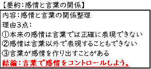 JUGEMテーマ:自己実現 おはようございます! 本日も、ご訪問ありがとうございます。 今回は、感情と言葉の関係について。 自分の感情を表現することは大切ですが同時に大変難しいことです。 今回は、感情と言葉の関係を整理しました。 ?本来の感情は言葉では正確に表現できない 人間の感情はいろいろなものが複雑に絡み合っています。 言葉で表現できるほど単純なものではなく、また明確なものでもありません。 言葉のような少ない語彙、短い内容で表現することは...