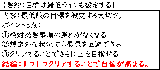 JUGEMテーマ:自己実現 おはようございます! 本日も、ご訪問ありがとうございます。 今回は、目標の最低ラインを設定する大切さについて。 志は高く持つことも大切ですが、達成が難しすぎる目標を設定してしまうと途中で挫折したり、些細なことにも完璧を目指す結果として肝心なことがおろそかになる可能性も高まります。 高い目標設定も大切ですが、同時に「最低これだけはやる」というラインも設定しましょう。 最低ラインの目標のメリットは下記になります。 ?絶対必要事項の漏れ...