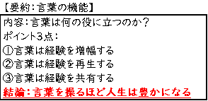 JUGEMテーマ:自己実現 おはようございます! 本日も、ご訪問ありがとうございます。 今回は言葉の機能についてです。 前回、「全ての言葉は経験を基礎に成り立っている」と書きました。 一方で、本を読むことで他人の経験を自分の物にすることができるように、言葉によって直接経験していないことを理解できることも事実です。 今回は、そのあたりを掘り下げてみます。 ?言葉は経験を増幅する 「経験」が伴っていないと、言葉を理解できない一方で、言葉を理解する経...