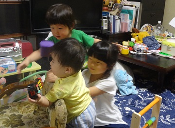 JUGEMテーマ:日々のくらし JUGEMテーマ:ありがとう 夫と私のよわいもの・・・ 勢ぞろいです。 孫三人が勢ぞろい。 母にとっては,久しぶりに曾孫三人が顔を見せてくれてうれしいにぎやかさになりました。 母の家の仏間は,7月四連休だけは,曾孫の遊び場と化し。 10ヶ月のKくんに絵本を読んでくれたAちゃん。 年長さんのAちゃん。赤ちゃんの絵本は,すらすら読んでくれました。 2歳7ヶ月のSくん。 Kくんに遊び方を教えてあげている...