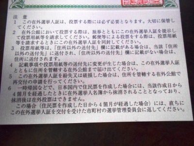 在外選挙人証というのは海外在住者でも国政選挙へ投票できる人が所持する物で、これは在留地の在外公館、即ちセブに置いては『在フィリピン日本大使館セブ出張駐在官事務所』へ申請して得る。 写真はその選挙人証で、大きさは免許証の3倍くらいの大きさの用紙で、写真は表側下部を写している。表側には交付番号があり、番号を読み取ると発行した選挙管理員会では8番目で、その日が登録月日になっているのかどうかは分からない。 氏名、生年月日、登録日と続き、衆議院小選挙区が記されていて、小...