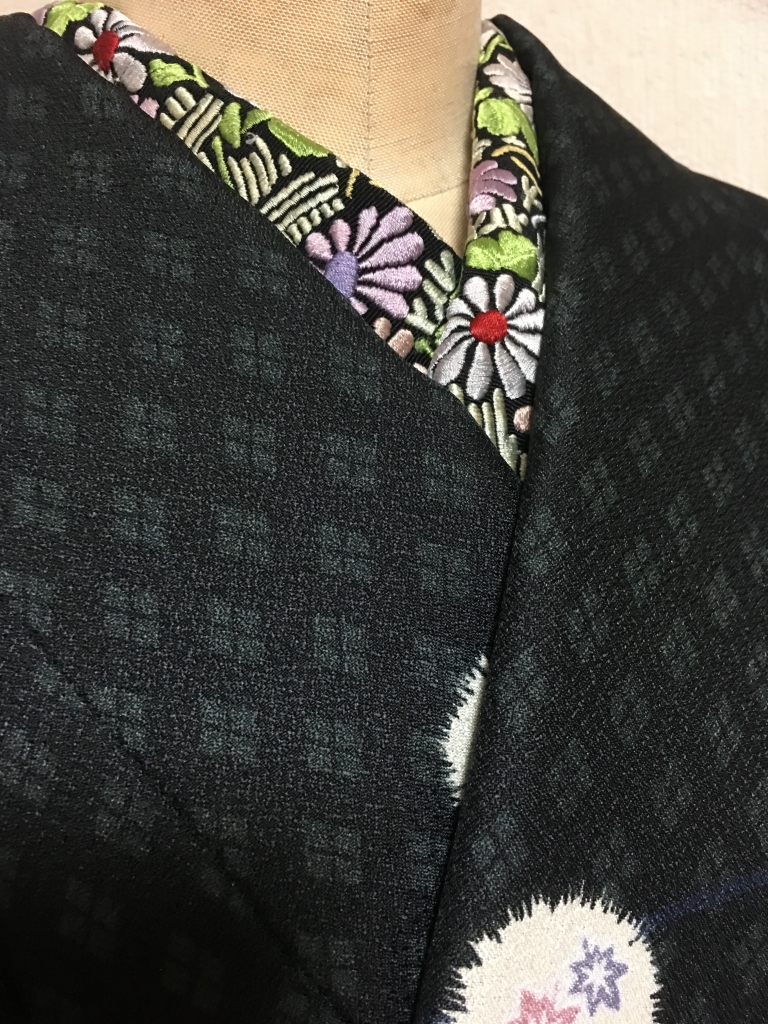 JUGEMテーマ:着物日和 黒地の塩瀬に刺繍が入った半襟。 かなりインパクトがあります。 今、これを買おうと思うかしら? まだまだ若く、着物のセオリーに頓着していなかった頃、 そう、多分20代の頃に衝動買いしたものです。 派手でもあり、粋でもあり、存在感も半端なく、 数回着けたきり、 ここ30年は、目の保養だけで仕舞い込んでいました。 髪が...