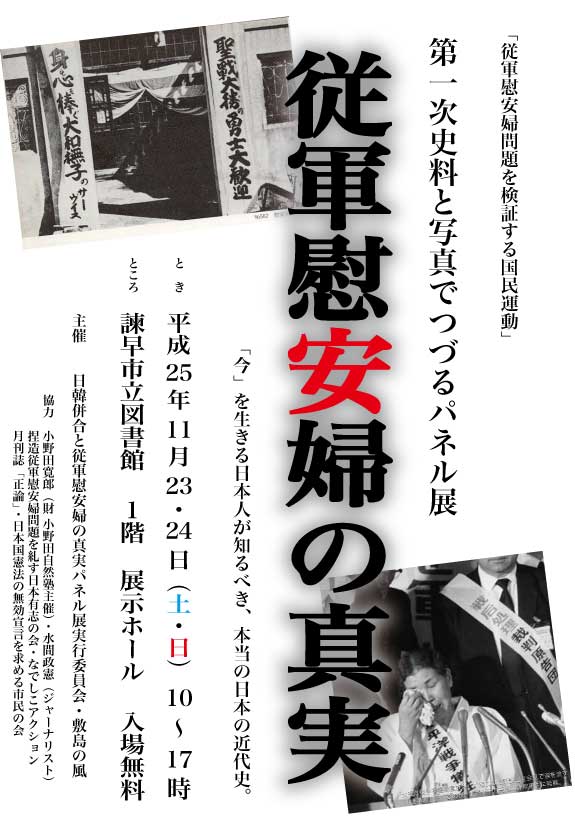 JUGEMテーマ:日本の文化 慰安婦展示会のお知らせ 「従軍慰安婦の真実」〜第一次史料と写真でつづるパネル展〜 皆様お誘い合わせの上ご来場お待ち申し上げます。 当日のお手伝いいただけるスタッフ大募集! 【日時】11月23(土)24(日)10:00〜17:00 【場所】諫早市立図書館 1階 展示ホール 【入場料】無料 〒854-0014 長崎県諫早市東小路町6番地30 TEL 0957-23-4946 / FAX 0957-21-0855 JR:諫早駅より徒歩20分 私鉄:島原鉄道本諫早駅より徒歩3分 バス:諫早局前下車徒歩5分 【主催】日韓併合と従軍慰安婦...