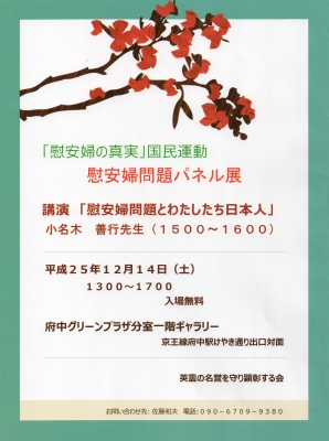 JUGEMテーマ:日本の文化 『慰安婦問題パネル展』 【日時】12月14日(土)13時〜17時 【場所】府中グリーンプラザ分館 1階ギャラリー 東京都府中市寿町1-1 電話:042-340-0211 【講演】小名木 善行氏(15時〜16時) 「慰安婦問題とわたしたち日本人」 【入場料】無料 【主催】英霊の名誉を守り顕彰する会 (佐藤:090-6709-9380) 【協力】捏造慰安婦問題を糺す日本有志の会 facebook:https://www.facebook.com/ianfumondai