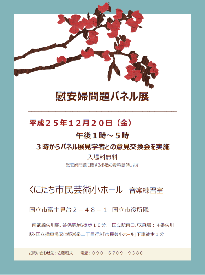 JUGEMテーマ:日本の文化 『慰安婦問題パネル展』 【日時】12月20日(金)13時〜17時(意見交換会は15時〜) 【場所】くにたち市民芸術小ホール 音楽練習室 東京都国立市富士見台2-48-1 電話:042-574-1515 国立市役所隣南武線矢川駅、谷保駅から徒歩10分 国立駅南口バス乗場4番 矢川駅・国立操車場又は都営泉二丁目行き「市民芸小ホール」下車徒歩1分 【入場料】無料 (慰安婦問題に関する多数の資料提供します!) 【主催】英霊の名誉を守り顕彰する会 (佐藤和夫:090-6709-9380...