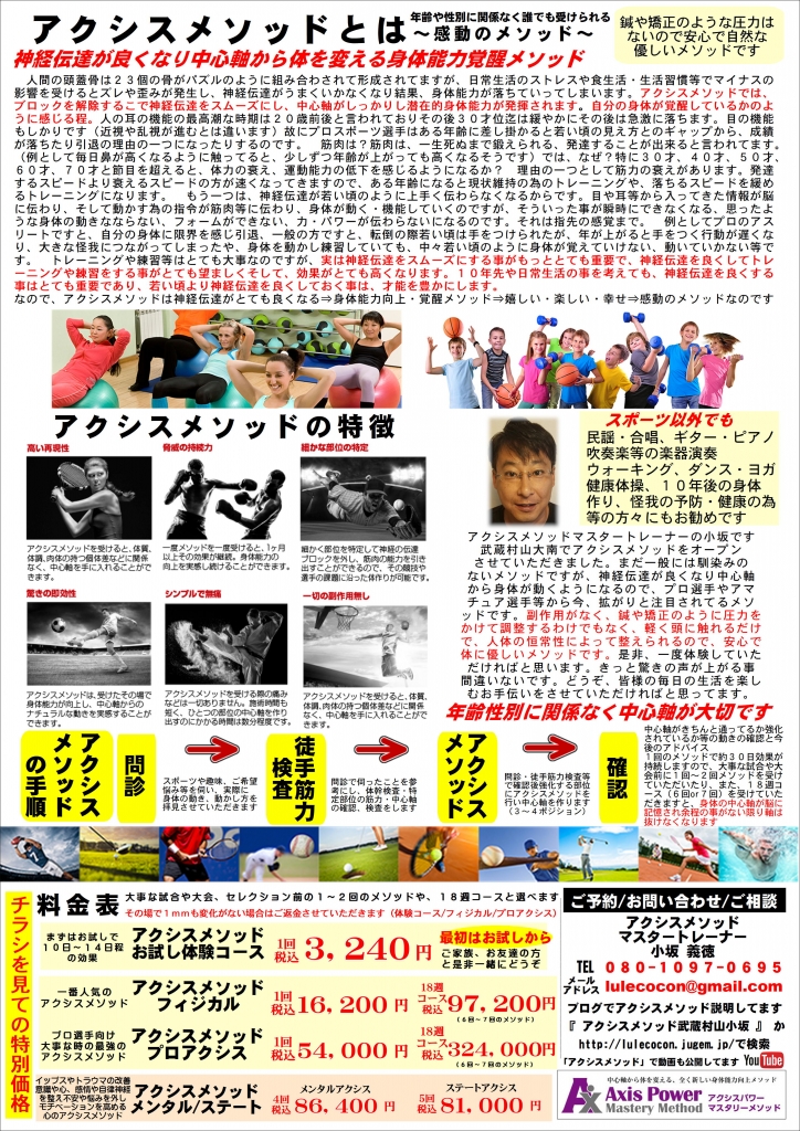 JUGEMテーマ:アクシスメソッド おはようございます 今朝は、雨降り後の綺麗な気持ちの良い青空です 今日も楽しんで頑張っていこうと思います 先日作りましたチラシの内容を少しづつ抜粋していきます アクシスメソッドはいくつか特徴があるのですがまず、ひとつめに、アクシスメソッドを受けるとその場で体の変化を実感されます 「驚きの即効性」があります 小学生からご年配の方と年齢、男性女性と性別関係なく、ほぼ100%の人がそ...