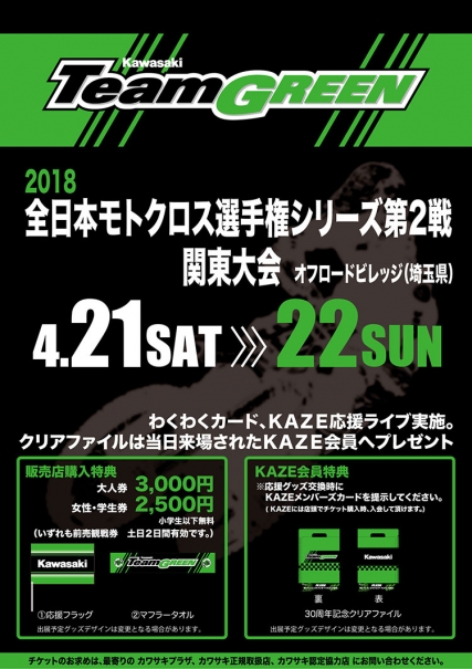 JUGEMテーマ:モータースポーツ 4/21〜4/22に埼玉県川越市のオフロードヴィレッジで開催される全日本モトクロス第2戦関東大会の カワサキ特典満載のカワサキ応援チケットを販売中です! (*^^)v 開幕戦HSR九州熊本大会で好調の地元ピュアテックレーシングも もちろん参戦しますので 是非、会場で生の迫力を堪能しながら熱い応援をお願いします! (*^^)v *開幕戦HSR九州熊本大会でのピュアテックレーシングの活躍と多くの全日本ライダーの ...
