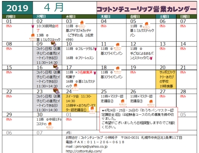 更新 2019.04.19 <190418> 4月21日(日)イオン発寒店「あそびの学校」 4月30日(月)午後「ドデカフォカッチャ」 受付終了 <190401> 4月2日(火)午前 教室ガイダンス 受付終了 4月3日(水)メニュー変更 ミルクスティック→ドデカフォカッチャに変更 1名様ご予約。2000円です。 グループレッスン可ですのであと2名さま受講可能です。 4月5日(金)メニュー変更 ドデカフォカッチャ→ミルクスティック 4月3日の変更...