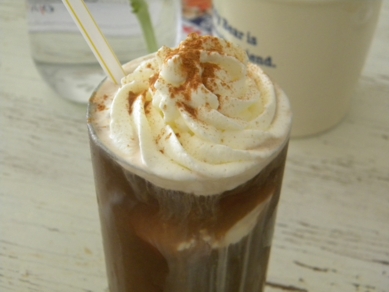 カフェのドリンクメニューとして考え中の アイスドコーヒー。 めざすところに(http://www.coffeeclub.com.au/menu/original-iced-coffee/) 少ぅしだけ近づいたような気がする。 表面張力でグラスに満タンだけど ちょっと動かすと溢れてテーブルを汚す。 入れ過ぎかな? 挿したストローで 下の方の濃い目ブラックなコーヒーを ズビズビって飲んでみる アイスクリームが溶けかけてちょうどいいね...