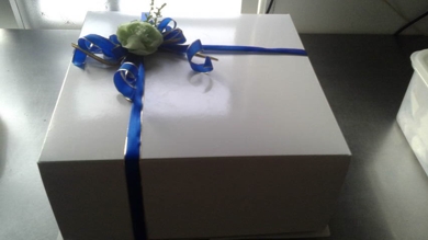 34センチ角の箱の中身は 31センチ角のバースデーケーキです。 某会社さま従業員一同さまよりのオーダーで、 代表様50歳のお誕生日だそうです。 「50本、ろうそくを立てたいので」というオーダーでした。 箱、ケーキを置いてから回りを立てるという箱。 この箱もやっと見つけました。 うちにある包装資材のカタログにも7号(21センチ)以上の箱が載ってないのです。 ...