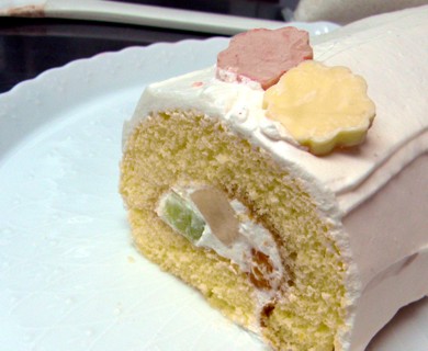 春は、ロール・オ・フリュイ。 フルーツのロールケーキ。 桜の形に型抜きしたチョコレートを飾って。 ホイップクリーム研究中につき、おなか、クリーム試食でだぼだぼ(>_