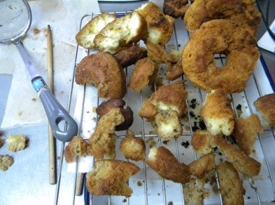 昔、作ってたレシピを相当いじった。 失敗だ。 油の温度の記録を取ろうとして手間取った。 失敗だ。 知ってる、だんだん、もーどーしていいかわからなくなるんだ。 工房中、家じゅうが、ドーナツ臭(くさ)っ。 失敗ドーナツは、 今日このあと、ごはん一緒する約束してる友達に、あげちゃうつもり。 不味くはないのさ、 たぶん大丈夫。 ◆救われる点:製造工程の写真が撮れたこと。 【追記】 チョコ掛けしてお友達にあげた。すまんっ! 【追記2015/1/6】 上記のドーナツを引き受けて食べてくれ...