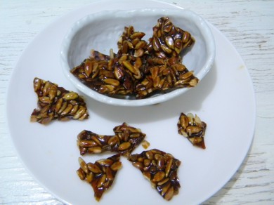 以前も作ってアップしたことがある、 べっ甲飴やプリンのカラメルソース作るみたいに お砂糖を少量のお水で煮詰めてちょっと焦がして そこに乾煎りしたナッツを混ぜて固めたお菓子、 こういうのの正式名称もわからないまま、 好きなので時々自分のおやつ用に作る。 オーブンペーパーの上に広げるとすぐに固まって、 パリんパリン割れるから、 寒い朝、水たまりが凍ってて、 学校に行く子供たちが長靴で割った、みたいな感じ。 苦くて 好き。 JUGEMテーマ:札幌グルメ!!