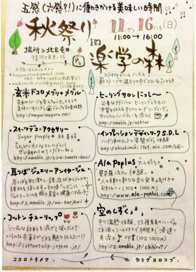 1年ぶりくらいのイベント出店です。 【楽学の森の秋祭り 〜五感(六感?!)に働きかける秋のお祭り】 2014年11月16日 札幌市北区屯田の楽学の森(自立型学習塾)にて、 【楽学の森の秋祭り 〜五感(六感?!)に働きかける秋のお祭り】を開催します。 日時:11月16日日曜日 11時から16時まで 場所:札幌市北区屯田9条10丁目8-15 楽学の森 パン・クッキー・マフィン・スコーン いろいろ持って行きます。 お近くの方も遠くの方もぜひいらしてください。 寒いですけど、ほっと暖かいおやつの時間を...