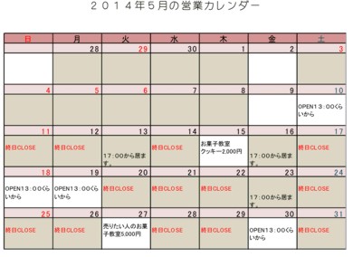 大きなカレンダーは ホームページにあります。 http://cottontulip.com/ 後半の日程です。 お菓子教室の日程が決まりました。 5月15日のクッキーは、初心者さん向け。 5月27日のは、上級者さん向け。 お気軽にどうぞ。お待ちしてますね。 グレーゾーンでクローズの日でも 夜19時ころから工房にいますので、 カラーセラピーもします。 お茶菓子つき。 その時食べたいお菓子があれば ご予約ください。焼いておきます。 焼かないものでも可、です。 ご予約お問合せ、 このブログのコメント欄でも良いですし...