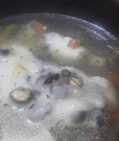 お正月のお餅がまだあった。 おはり子さんにもらった、 自家製豆餅。 黒豆がごろごろ。 黒豆を、 もちで繋いだんじゃないか、って思うくらい 黒豆がたーくさん入っている。 中華スープでお雑煮。 お餅は、 オーブントースターで焦げ目がついて プーンって膨れるくらいに焼いておいて。 スープのお鍋で柔らかく、なんて考えて スープのお鍋に入れとくと、 お鍋にくっついてドロドロになっちゃうからね(^^)v 札幌猛吹雪。 家の玄関の前が吹きだまりで戸を開けるのたいへん(-_-;) 熱いスープにとろけるお餅...
