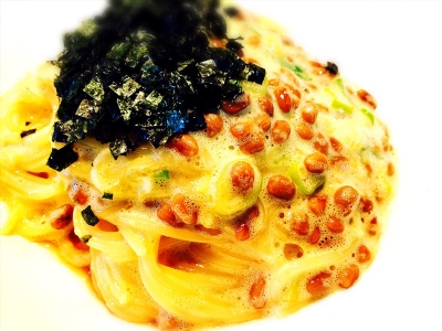 JUGEMテーマ:お家ごはん 冷蔵庫整理? と、和風をアレンジした、ちょいイタリアンな風味が10分で出来ます。 ----- 材料 (1人分)------ スパゲッティ 1人分 茹で塩 分量外 材料A【卵黄 1個分、納豆 1パック、チューブにんにく 2〜3センチ、ネギ お好きな量で、2倍濃縮麺つゆ 大1、醤油 小1】 刻み海苔 ----------------------------- 1.スパゲッティを茹でる間にソースを作る Aを全てよく混ぜて、茹であげたスパゲッティを加え、混ぜ合わせる。 2.お皿に盛り...