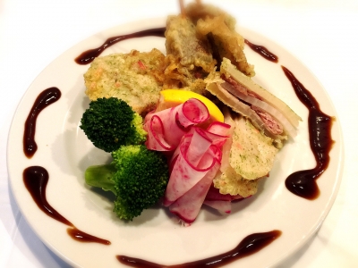 JUGEMテーマ:お家ごはん お正月に食べ過ぎた体に、ヘルシーなこんにゃくと大根を食べやすく磯辺揚げにして天ぷらにしました。 こんにゃくの煮付けでも大根の煮物でも美味しく天ぷらになります。 ----- 材料 (2人分) --------- 洗ったこんにゃく 1枚 薄切り大根 200g 豚肉 50g ※お好みで 串 4本 天ぷら粉50gを水で溶いたもの A 【塩 小1、刻んだ紅生姜 大1、青のり粉 大1】 油 適量 お好きな付け合わせ ------------------------------- 1.大根、肉、大根、肉、大根と挟む。 こんにゃくは薄切り...