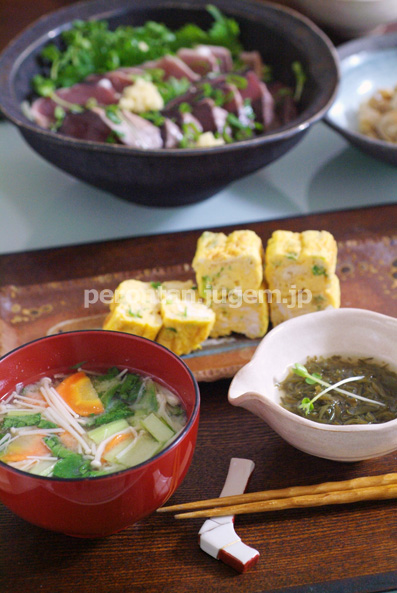 今夜もメインは、月に一度くらいの月イチメニューかつおのタタキ切るだけ^^盛り付けるだけ家人さんの好物、ありがたいメニューしかも♪切ってくれた〜(教育の賜物です!!笑)たまご焼き味付きのめかぶ白菜のお漬物野菜のおみそ汁色が黒っぽいのは、ピントが合わせにくい今日はピンが奥に行っちゃった〜最近…思う事、オートで撮ろうか?あはは写真の師匠にバレないように 笑ゆうべ焼いたたまご焼きは揚げと小葱入り実は、これが失敗作のリメイク「たまご巾着」を作ろうと思っていたのだ(正式な名前は不明、揚げの中...