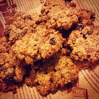 というわけで焼きました〜。 レーズンとアーモンド入り、 オートミールと全粒粉のザクザククッキー! 焼いてる最中からいい香り〜。 焼きたてがおいしくて とまらなくなりそうだったけど、 我慢しました(-_-) 簡単だしまた作ろーっと。