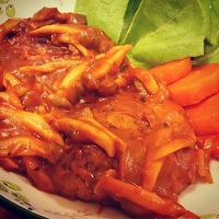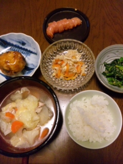 今日の晩ごはんは夫のリクエストで煮込みハンバーグ! 付け合せは和風人参グラッセとサラダ菜。 ポテトはお腹膨れるからやめといた。 ハンバーグはねー、両面焼き目つけてから一旦よけて、 バターで野菜炒めて、別に炒めておいた小麦粉も加えて、 水と調味料も入れて、ハンバーグを戻して弱火で煮込む! 普通のハンバーグも好きだけど、 煮込みハンバーグはなんか豪華さ増すよね。 夫もよろこんで完食してました。 そして食後にまったりしていると またまた「俺、、一人暮らし…大丈夫かな...