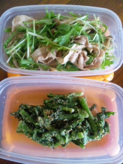 JUGEMテーマ:お家ごはん 豚肉の冷しゃぶのサラダ 春菊の胡麻和え 豚肉の冷しゃぶサラダ 季節的にはまだ暖かいしゃぶしゃぶの方がいいですが、 さっぱりとサラダで食べたい! サラダというか和え物? たれはゆずぽん酢とわさびを合わせたもの。 しゃぶしゃぶした豚肉 さっとゆがいたしめじ 水菜 豚肉はお水に入れざるにあげて、しめじの粗熱が取れたら 豚肉・しめじ・水菜をたれで和えたもの。 わさびがいいアクセントです。 もう一品。 春菊の胡麻和え 鍋物によく入れる春菊。 子ども達...