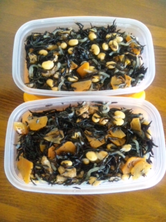 JUGEMテーマ:お家ごはん 昨日の残り物のそばつゆ。 捨てるのも勿体ので そばつゆを利用してひじきの煮物を作った。 ひじき1袋戻したので そばつゆは足りなかったが、 めんつゆ、ほんだしを足して作った。 大豆、糸こんも入れたので 鍋いっぱいになり、すごい量が出来た。 しばらく・・・ひじきが続く。 ひじきご飯、豆腐の白和えでも良さそうだわ。 味はあまり甘くなく、おいしく出来ました。 めんつゆ・・・えらい。