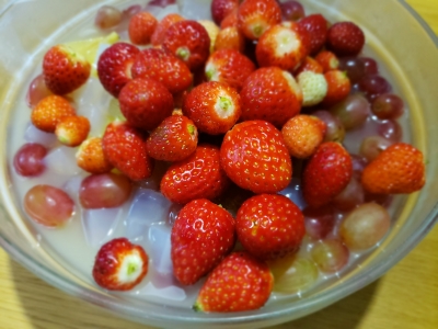 JUGEMテーマ:これ食べた、これ作った 2019/05/15 我が家のフルーツポンチに、家庭菜園で実ったイチゴを加えた。