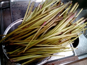 実家に、親の田舎の友人から大量の蕗が送られてきました。 またしても、「なんとかしてー」と言われたので、持ち帰って伽羅蕗を作りました。 これも例年通り、春の風物詩です。 水の中に浸けて、一本一本、手拭いで拭いて、表面の泥やごみ、うぶ毛を落とす。 まる一日陰干しして(写真なし)、 適当な長さに切る。 炊き始めてから一日め。 炊き始めてから3日目。 ...