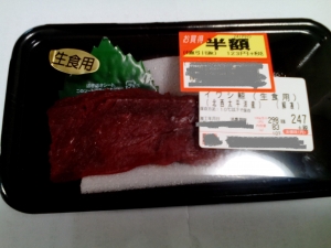 帰宅途中、乗り継ぎ駅のスーパーでイワシ鯨のお刺身が半額に。 テーブルコショーが切れてた……!! 断腸ッ……! わさび醤油で食べました。 (鯨の調味料はテーブルコショーでないと満足感がイマイチ) 明るく映りすぎたけど、実物はもうちょっと黒っぽいです。 鯨だしね。 食べるたびに思うけど、クジラの味って明らかに魚ですね。 哺乳類なのに。 海に住んでたから...