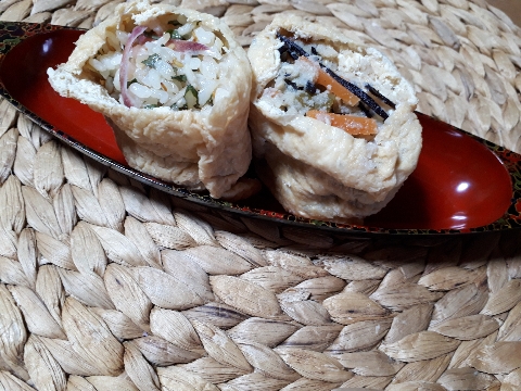 JUGEMテーマ:これ食べた、これ作った 昨日、油揚げやひじきを置いておいたら・・・ 食卓に美味しいおいなりさんが出来ていました。 ひとつはご飯、ひとつはおからが入っています。いただきま〜す。