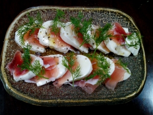 晩酌のつまみに、カプレーゼを作りました。 チーズ会社のガレージセールで仕入れてきた格安モッツァレラチーズに、近所のスーパーで3割引きだった生ハム。 岩塩と黒コショウをミルで挽いて、オリーブオイルをたら〜り。 ハーブは、冷蔵庫に残ってたディルです。 写真の一皿で、原価300円弱くらいです。 香りづけに、到来もののザクロビネガーを軽く振りかけました。 昨日もらったばかりなのでまだ試していませんが、これ、水で割って飲むもの...