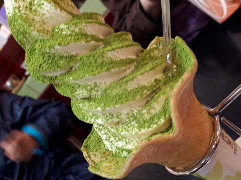 JUGEMテーマ:これ食べた、これ作った お茶屋さんで、抹茶かけソフトクリームを食べました。 抹茶を練り込んでいるのではなく、上からふんだんに振りかけているのです。 なので、よーくまぜまぜしないと抹茶がこぼれてしまいます。 抹茶の良い香りを楽しみつつ、いただきマース。