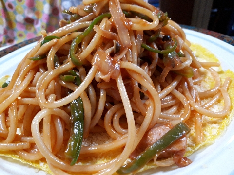 JUGEMテーマ:これ食べた、これ作った スパゲットーニとたっぷりピーマンのナポリタン。 玉子の薄焼きが敷いてあって、味のアクセントになっています。 ケチャップは甘みのあるカゴ○を用意しておいて下さい! 小人さんから指定されました。買っておきます。