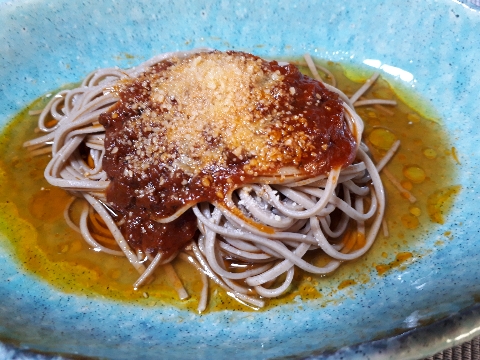 JUGEMテーマ:これ食べた、これ作った 頂いた鹿児島そばと、買い置きしておいたボロネーゼ風大豆ソースのコラボ。 良質のオリーブオイルが美味しさを引き立てます。