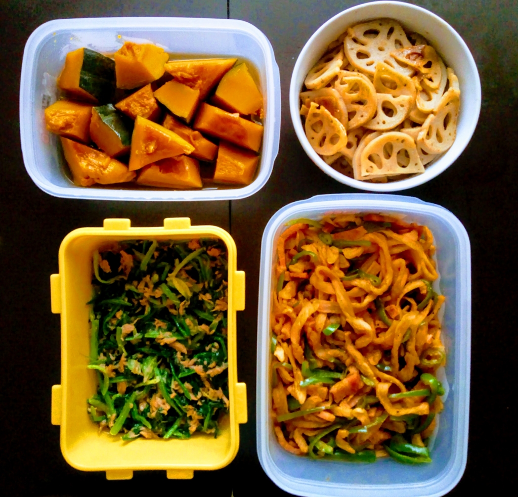 JUGEMテーマ:これ食べた、これ作った こんにちは。ここなです 平日の夜にちゃんとご飯をつくりたくても、どうしても無理で野菜不足になりがちなので、久しぶりににつくりおきをすることにしました。 本日つくった4品 かぼちゃの煮物、レンコンの味ポンきんぴら ほうれん草とツナのオイスター炒め、切り干し大根のナポリタン風 脱単品料理! 毎週UPできるように頑張るぞ〜