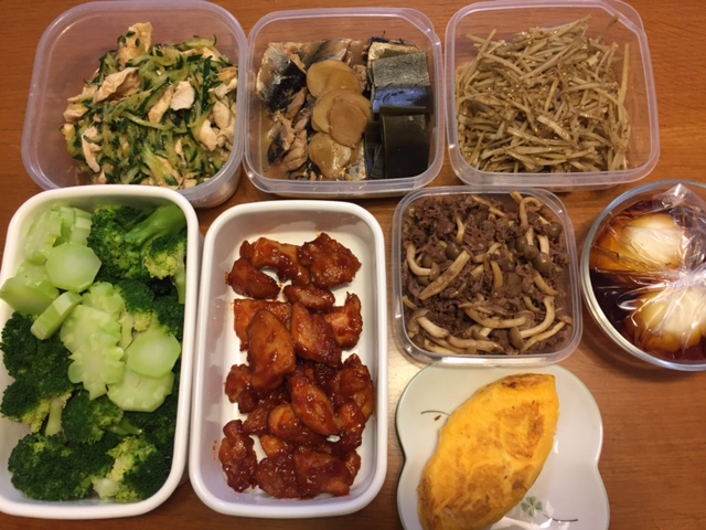 今週の作り置きです。 ・鶏のささみときゅうりのごまだれ和え ・いわしのしょうが煮 ・きんぴらごぼう ・ゆでブロッコリー ・ヤンニョムチキン ・牛肉としめじのすき焼き風 ・めんつゆ漬け卵 ・甘い卵焼き いわしの下処理に手間取り、全部作るまでに3時間ぐらいかかってしまいました。。 いわしのしょうが煮は、酢を入れたお湯で下ゆでを15分。 一度洗って、煮汁を作りことこと煮込みました。 なべ底に昆布を敷いて煮たのですが、昆布はだし用かと思いきや、 やわらかく味がし...